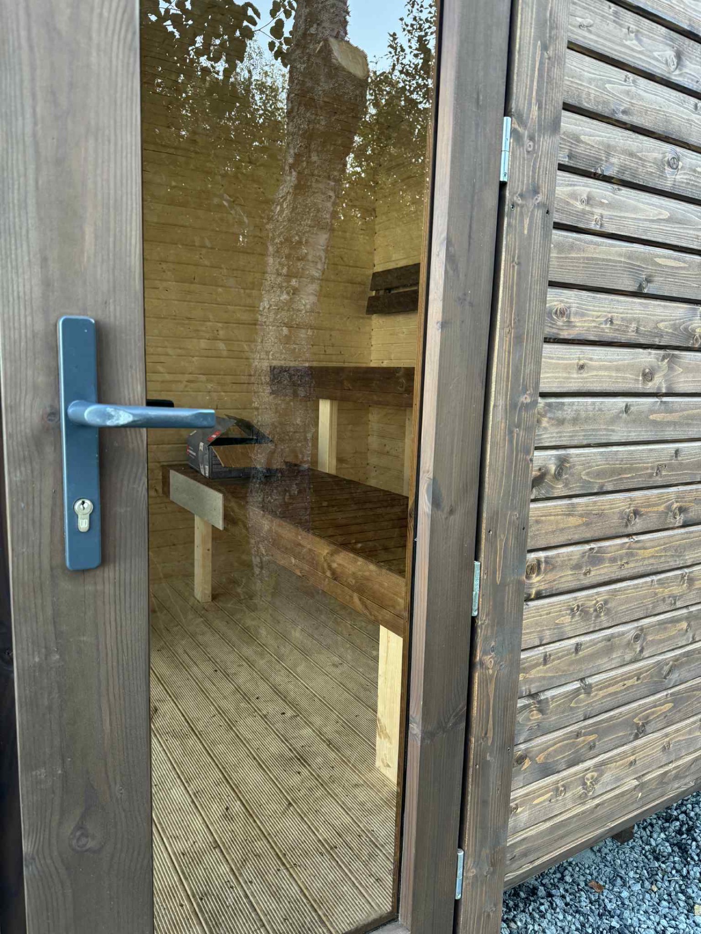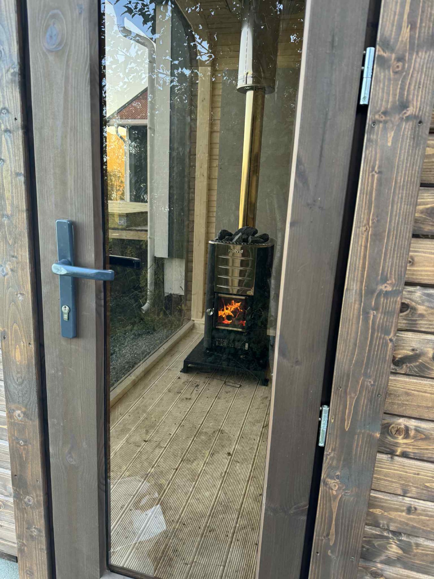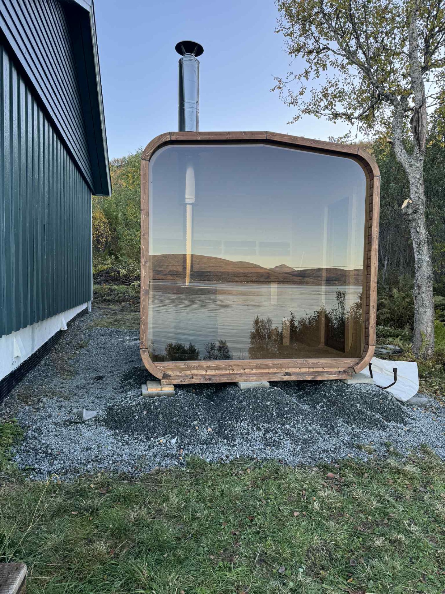 Badstuen leveres med 2 lite vinduer og uten ovn. Badstuen leveres bare montert.