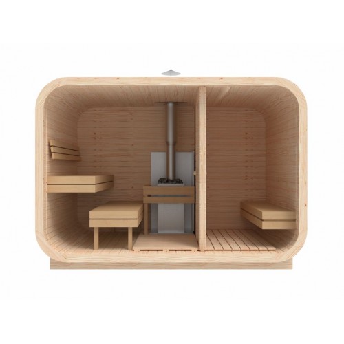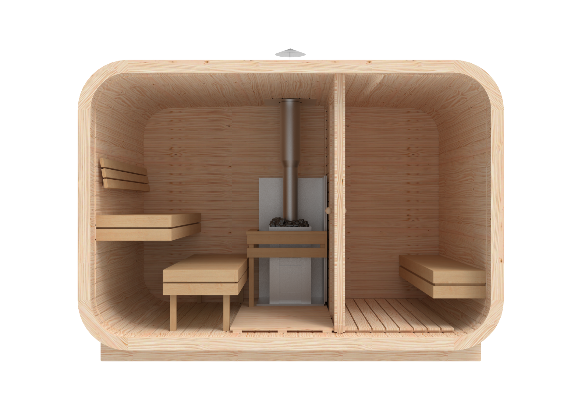 Vi tilbyr å vore kunder denne versjonen med garderobe, da vi vet mange badstue folk verdsetter å ha et forrom å kjøle seg og kle om i forbindelse med badstue økten. Dessuten blir badstue rommet ikke nedkjølet av kald luft når noen skal inn og ut av badstue rommet. Forrommet er med benk og vi kan montere LED lys og Harvia lamper med tre deksel.